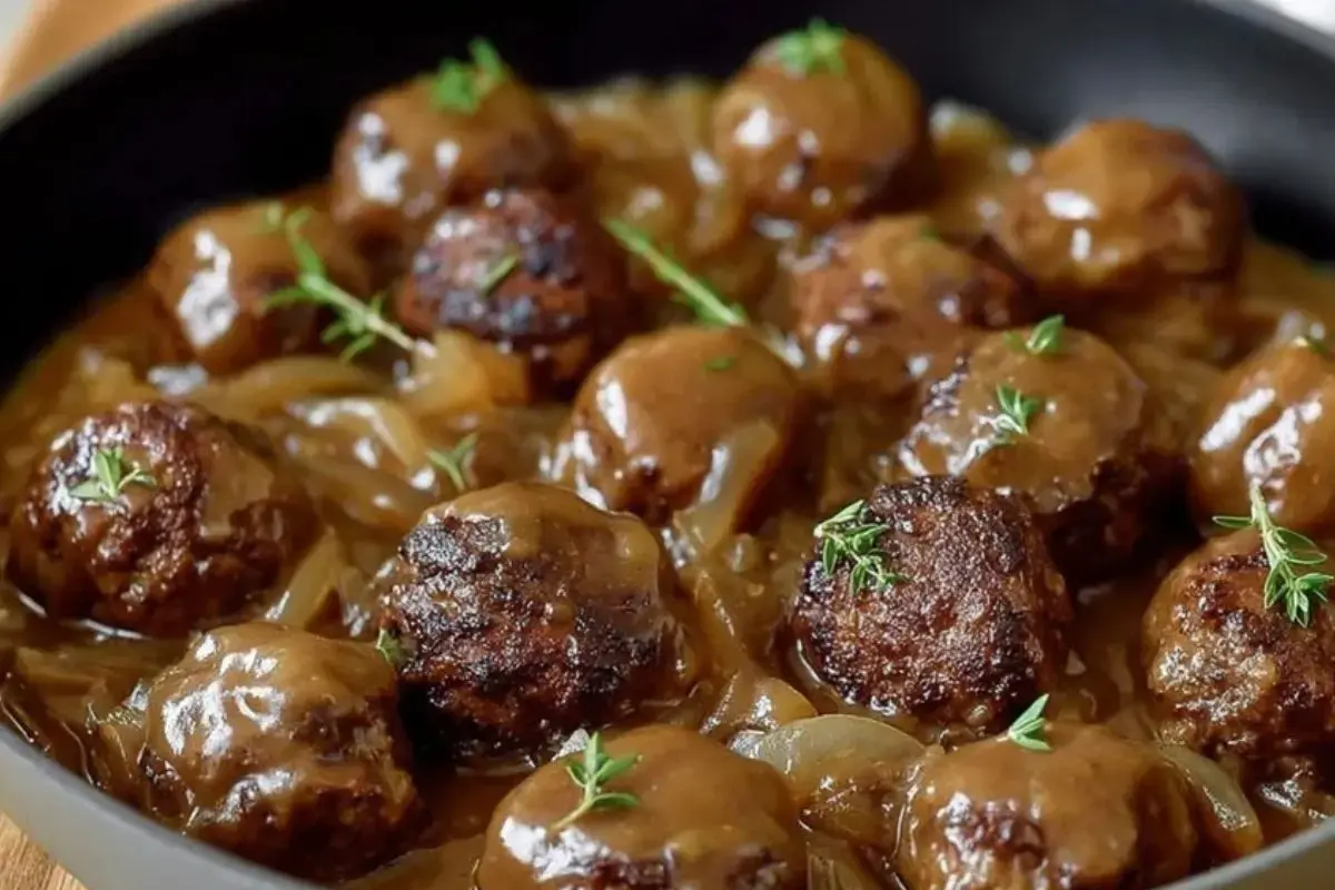 Sink into the ultimate comfort food with these juicy baked meatballs smothered in rich onion gravy. Perfect over mashed potatoes or noodles, this hearty dinner warms you from the inside out.