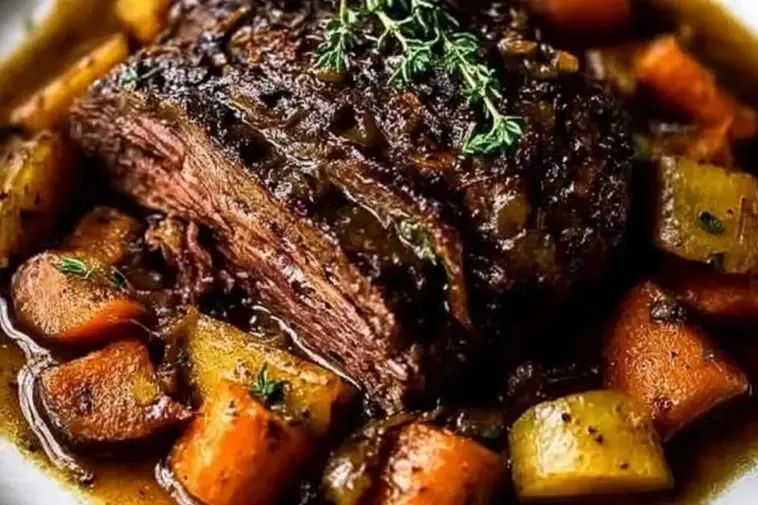 3 pounds chuck roast 1 tablespoon olive oil 1 teaspoon salt 1 teaspoon black pepper 1 pound carrots, peeled and cut into chunks 1 ½ pounds Yukon Gold potatoes, halved 1 large onion, chopped 4 cloves garlic, minced 2 cups beef broth 2 tablespoons tomato paste 2 tablespoons Worcestershire sauce 1 teaspoon dried thyme 1 teaspoon dried rosemary