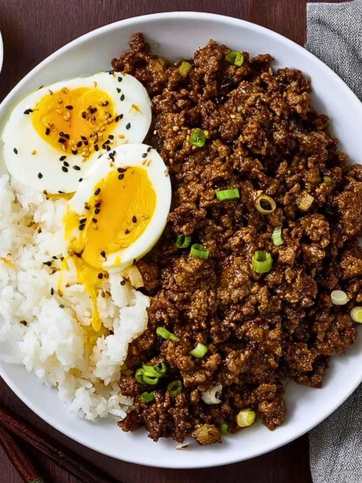 1 lb ground beef ¼ cup soy sauce 2 tablespoons brown sugar 4 cloves garlic, minced 1 teaspoon fresh ginger, grated 1 tablespoon sesame oil 3 green onions, sliced ¼ teaspoon crushed red pepper flakes (optional) 2 cups cooked white rice (for serving)